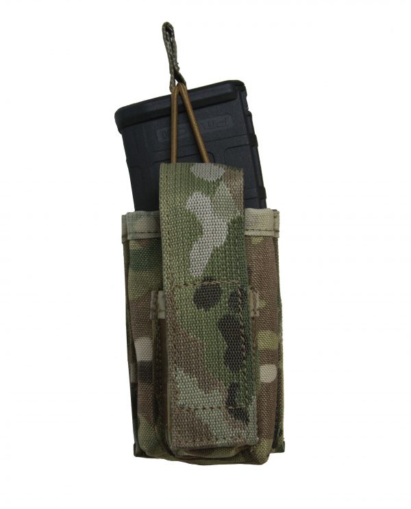 This combo is designed to hold rifle magazines with pistol magazines on the outside. Rifle magazines are retained with a bungy cord and pistol magazines with a velcro flap.